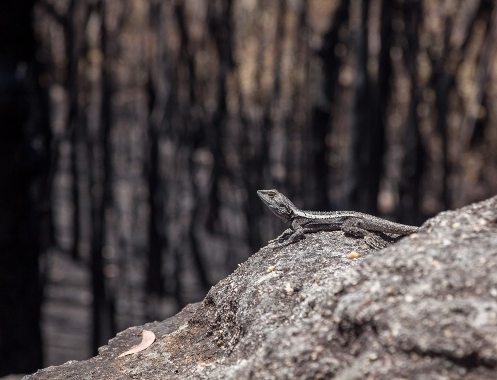 It has been estimated that billions of vertebrate animals perished in the vast fires of 2019-2020. Animals don’t just die by getting burnt or from smoke. Some survive the fire, then succumb later from injuries, or later still from starvation if their food sources have been destroyed. Who knows if this lucky lizard got through the next phase.